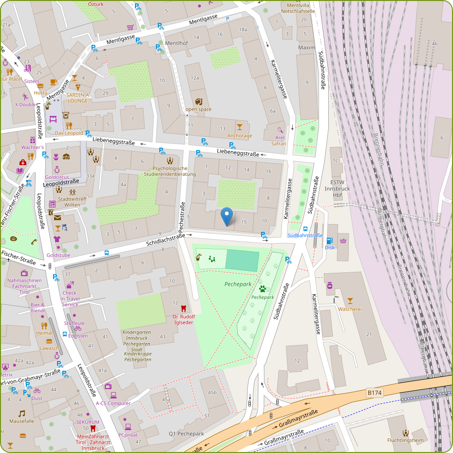Die Praxis befindet sich unweit der B174, welche sowohl von der Abfahrt Innsbruck-West als auch von der Abfahrt Innsbruck-Mitte über die Resselstraße an die A12 angebunden.